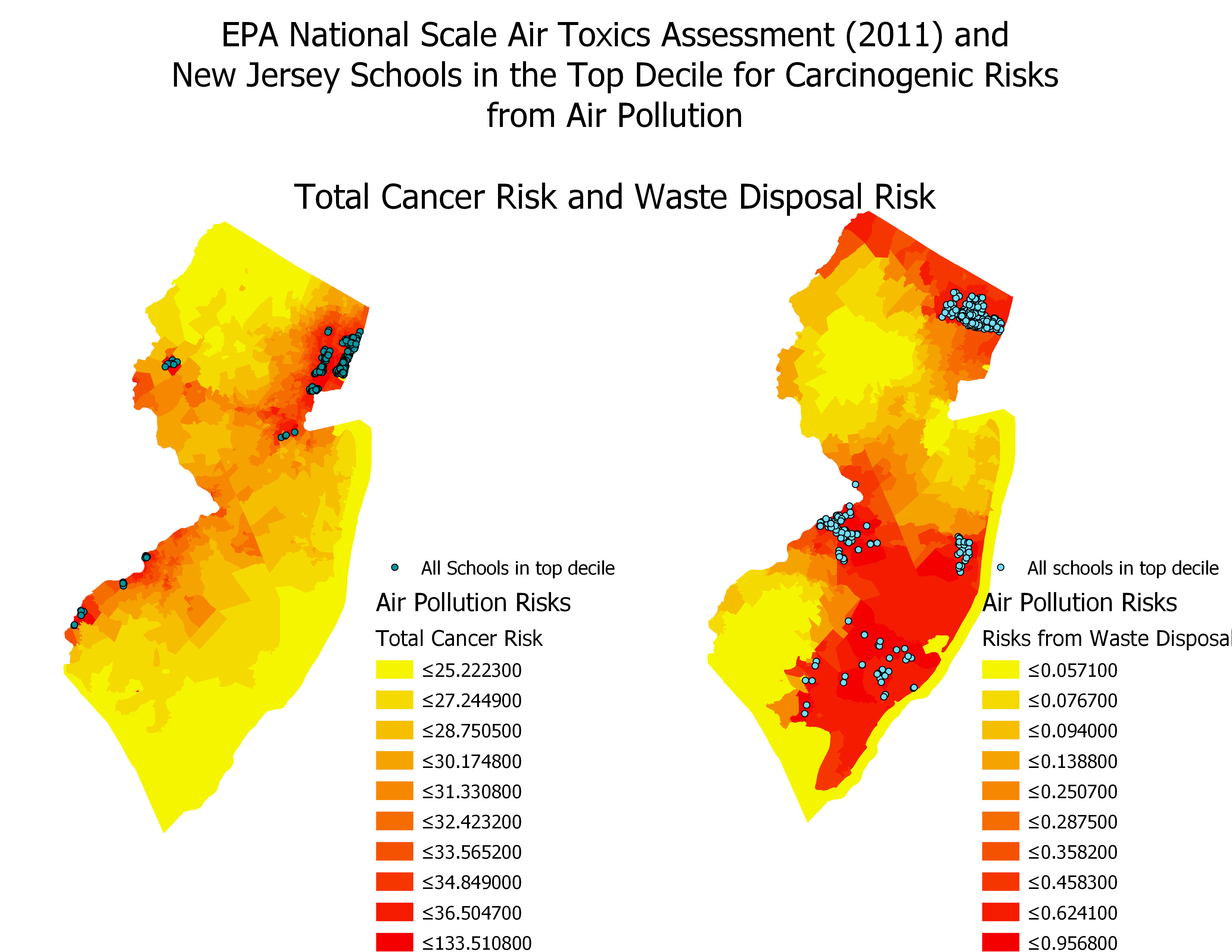 Using the EPA National Air Toxics Assessment, I was able to map the schools in New Jersey that are at the highest risk of carcinogen exposure from air pollution. On the left is the total cancer risk for these schools with the schools in the top decile indicated by the small blue dots. On the right are the schools at the highest risk from waste disposal. Notice the overlap in Northeast NJ.